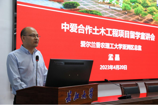 座谈会后,学院副院长肖桃李陪同孟晶老师来到15教报告厅,为土木工程中外合作办学三个年级的学生开展留学宣讲,并现场连线爱尔兰香农理工大学国际处主任Mary Simpson,在线解答出国交流政策、国外学习生活、课程学分转换等学生关注问题。