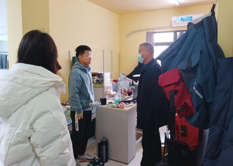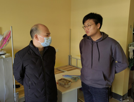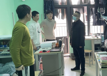 在9教四楼研究生工作室,张继承仔细询问了研究生的学习科研进展,以及寒假离校安排,同时,进一步了解了学生的需求,为接下来的线上教学工作稳步推进打下良好基础。