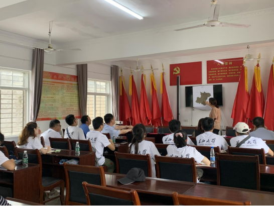 见面会结束后,大家进行了合影留念。紧接着,在放置好行李物品之后,实践队员冒着大雨先后乘车到牌坊村和马店村进行了实地走访,形成初步了解。牌坊村党支部书记姜保梅就该村基本情况做了介绍,并重点介绍了该村依靠超级水稻种植、流水养鱼项目、光伏发电站、猫砂厂等主导产业,带动农民就业增收的情况。马店村党支部书记任善炯带领师生前往正在该村建设的荆州市殡葬管理所工地,就如何围绕该民生工程做好配套服务,发展该村特色行业同师生进行了交流。