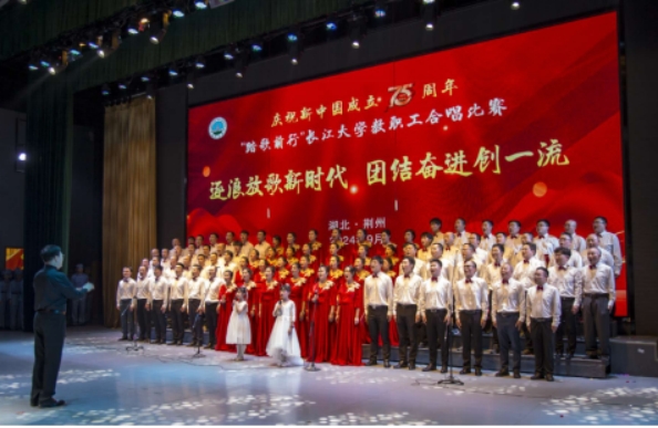 “迎着红日,迎着长江……”伴着童声朗诵,合唱正式拉开序幕。在指挥激情的带动下,老师们齐声合唱彰显磅礴气势,男声女声交替演唱更显新意。老师们用心设计,精心编排,克服重重困难。用饱满的热情、昂扬的精神、深情的演唱,表达爱党爱国爱校的赤诚情怀,展现城建人积极向上的昂扬斗志和团结进取的精神风貌。