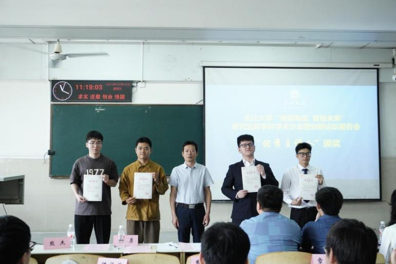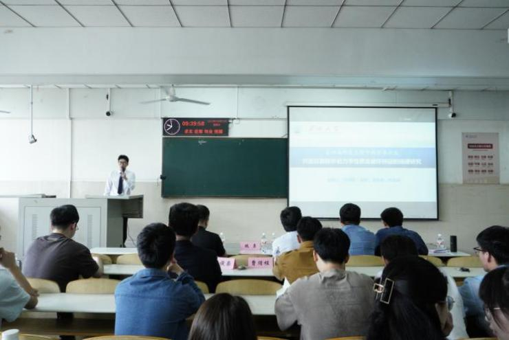 章德超、马乾坤,电信学院陈俊荣、曹熠程四位同学分别就《共面双裂隙砂岩力学性质及破坏特征的规律研究》;《井下动液面深度测量方法与仪器研究》;《掺加不同辅助胶凝材料橡胶混凝土高温后性能及超声评估研究》和学科竞赛相关经验依次做出分享。