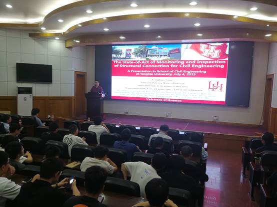 在11教学术报告厅举行了“长大20年”学术论坛暨长江城建讲坛(2023年第七讲)的学术讲座。美国休斯顿大学智能材料和结构实验室创始人、实验室主任、美国休斯顿大学宋钢兵教授做客讲坛,并为学院师生作了题为“The State-of-the Art in Monitoring and Inspection of Structural Connection for Civil Engineering”的学术讲座,学院大约120位教师和研究生参加了此次活动。