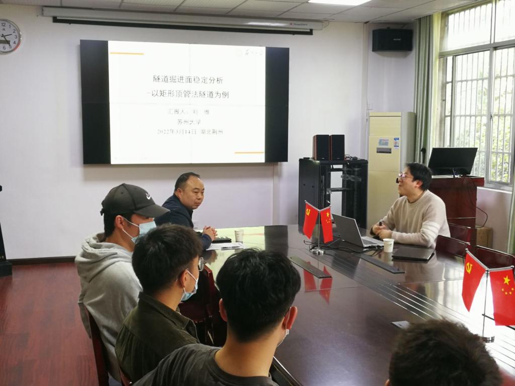 在9教208会议室举行了2022年长江城建讲坛第六讲的学术讲座,苏州大学轨道交通学院副教授刘维博士做客讲坛,并为学院教师作了题为“城市地下隧道掘进地层稳定分析—以矩形顶管法隧道为例”的学术讲座,学院三十几位师生参加了活动。