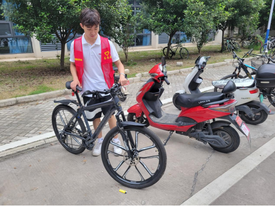 此外,志愿者们还将宿舍楼外的单车摆放整齐,为毕业生搬运行李打扫出干净畅通的通道。