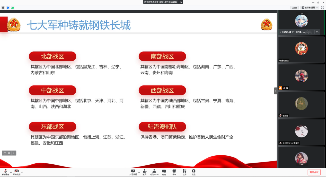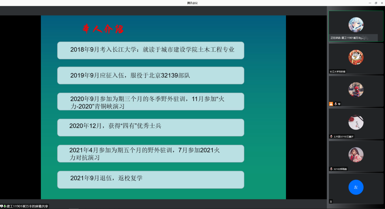 2021级全体学生在11月24日晚上通过腾讯会议参会,其他年级有参军意向的在校生于26日中午在22栋A124参加会议。本次宣讲会由学院征兵专干、20级辅导员刘安琪主持,征兵宣讲员崔万丰、蒋志兵进行相关宣讲。