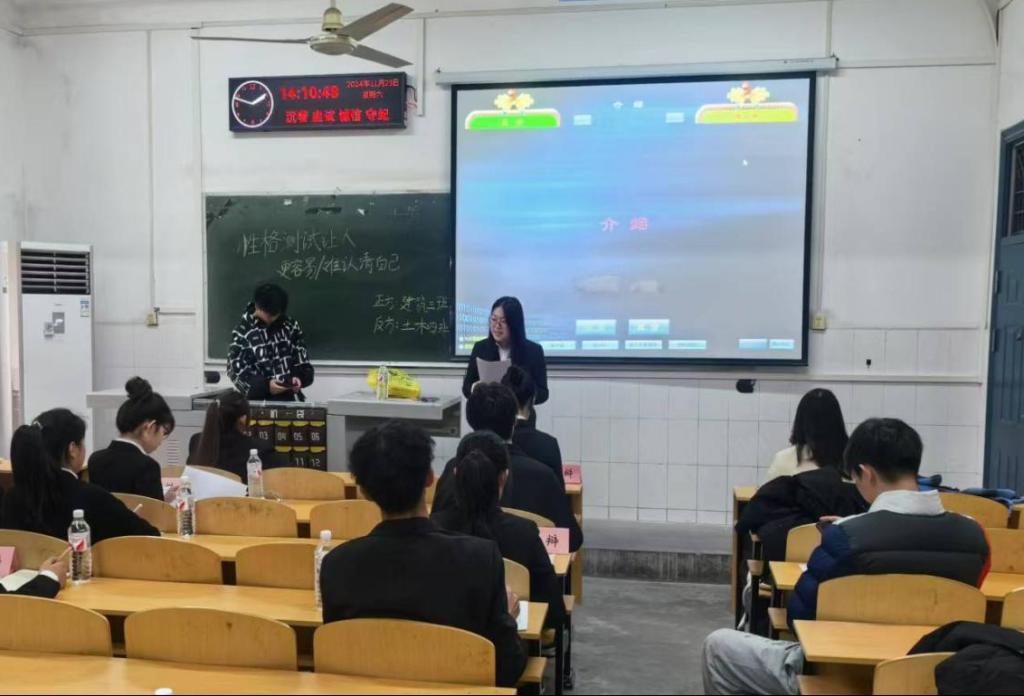 在西校区2教208教室举办第十一届“博弈杯”辩论赛决赛。本次辩论赛由2024级辅导员袁子昂、兼辅韩佳涛以及校队队员担任评委,土木类32405班焦扬同学主持。