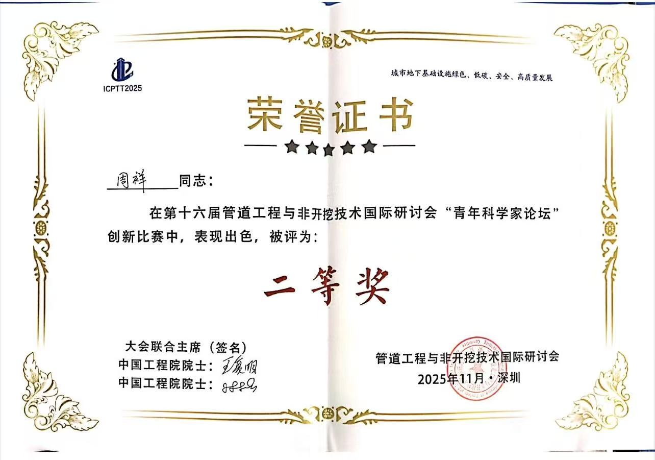 (通讯员 周祥)第16届管道工程与非开挖技术国际研讨会于2025年11月5日-11月8日在深圳召开,会议紧扣国家重大战略需求,致力于推动管道工程和非开挖技术领域的创新性科研成果、新技术和先进工程经验的深入探讨与交流,协同攻克行业复杂问题。 在学院教授肖桃李、产业教授武超毅两位老师的指导下,2024级研究生周祥以非开挖顶管技术中较常见的“管端屈曲破坏”为研究对象,深入工程现场2个多月,开展调研、分析测试、数值模拟、现场验证等工作,研发出“一种便捷式防止非开挖顶管管端屈曲破坏的装置——承插式环状带弧夹板”,并以此成果参加本次会议的“青年科学家论坛”创新比赛,表现出色,获评二等奖,与会专家认为:这一创新成果不仅具有重要的学术价值,更具有广阔的应用前景,它有望在实际工程中得到广泛应用,提高非开挖顶管工程的质量和效率,降低工程成本,为我国城市地下管线基础设施建设做出重要贡献。 会议期间,18av 研究生认真聆听专家学者的学术报告,并主动虚心请教、积极交流探讨。此次研讨会为18av 研究生提供了一个展示科研成果的重要平台,也为18av 与国内外同行的交流合作提供了宝贵机会。学院将以此为契机,进一步加强学科建设和人才培养,推动管道工程与非开挖技术领域的科研创新和发展。 (审核 肖桃李 编辑 杨洁晶)